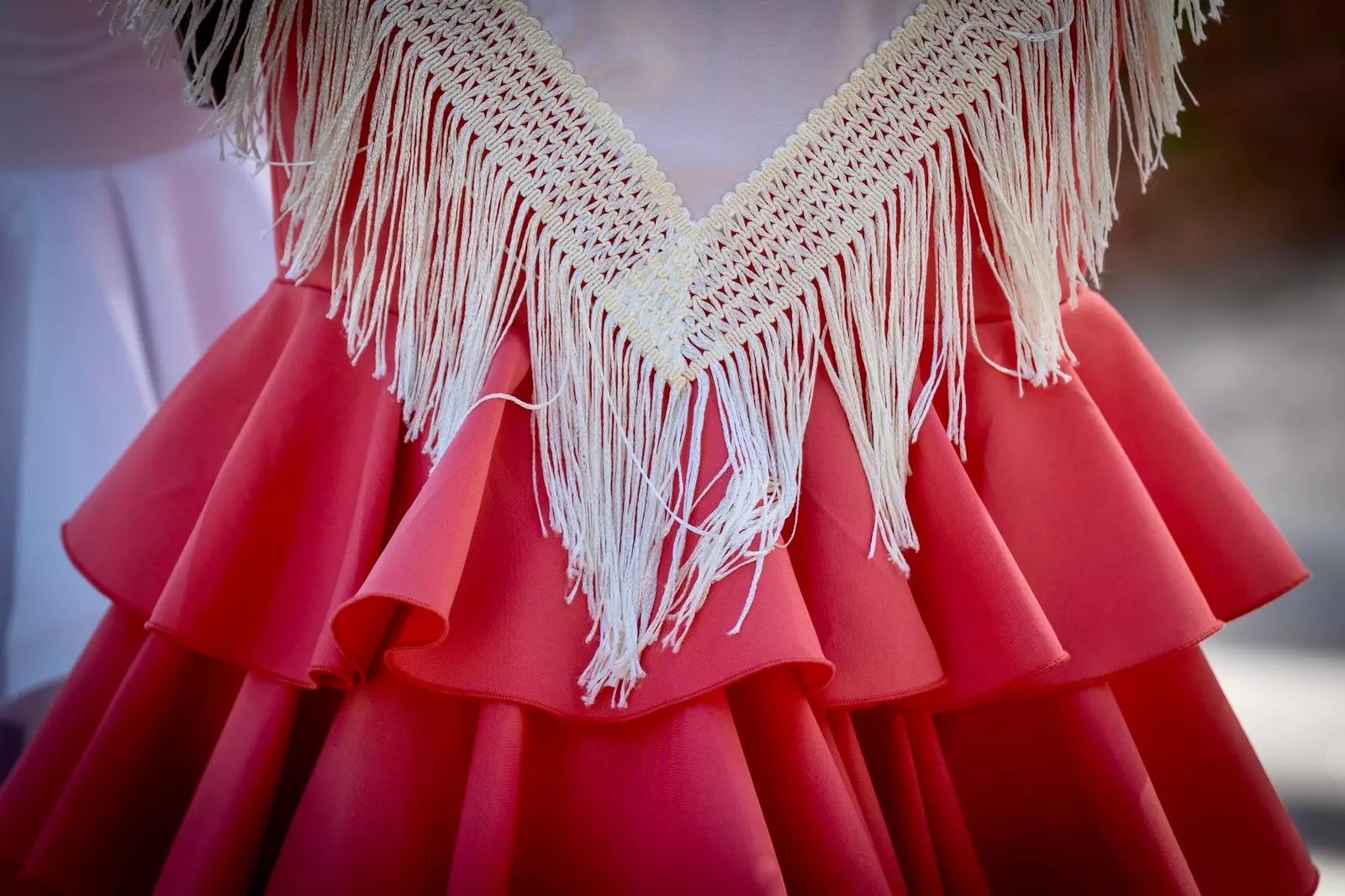 - Traje de flamenca para ellas, compuesto por un corpiño ajustado y una falda adornada con volantes y amplia. Colores vivos y estampados.