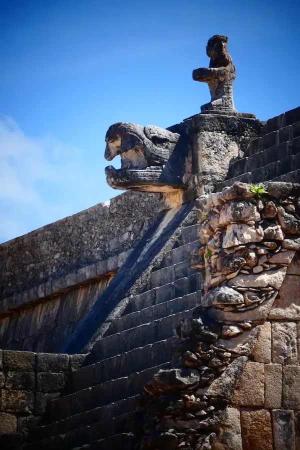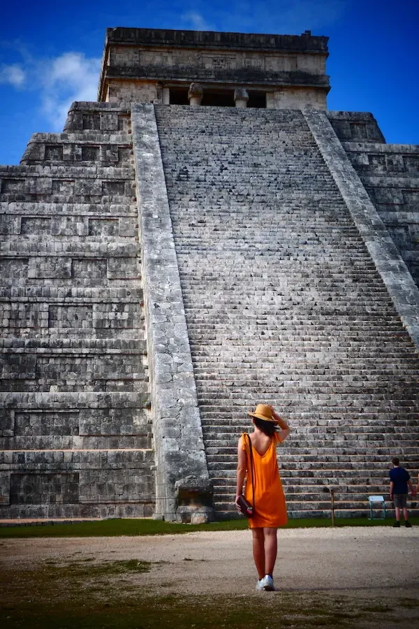 Su figura más imponente, la pirámide de Kukulcán (también conocida como El Castillo), es un templo escalonado de piedra caliza construido por la civilización maya en el siglo XII, y domina todo el complejo arqueológico con sus treinta metros de altura.
